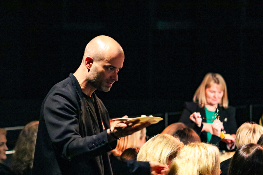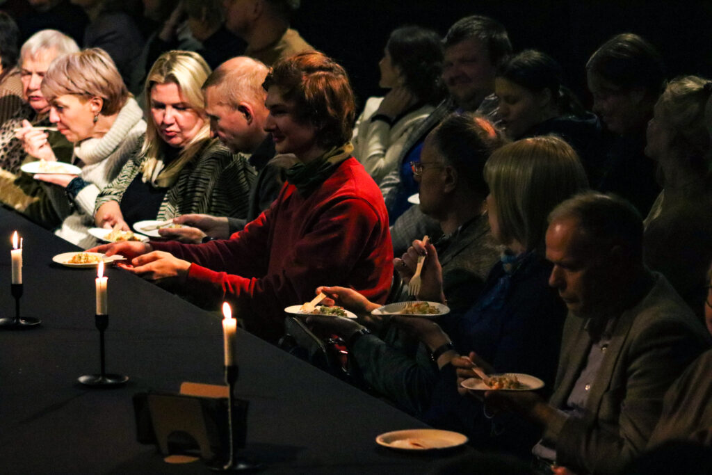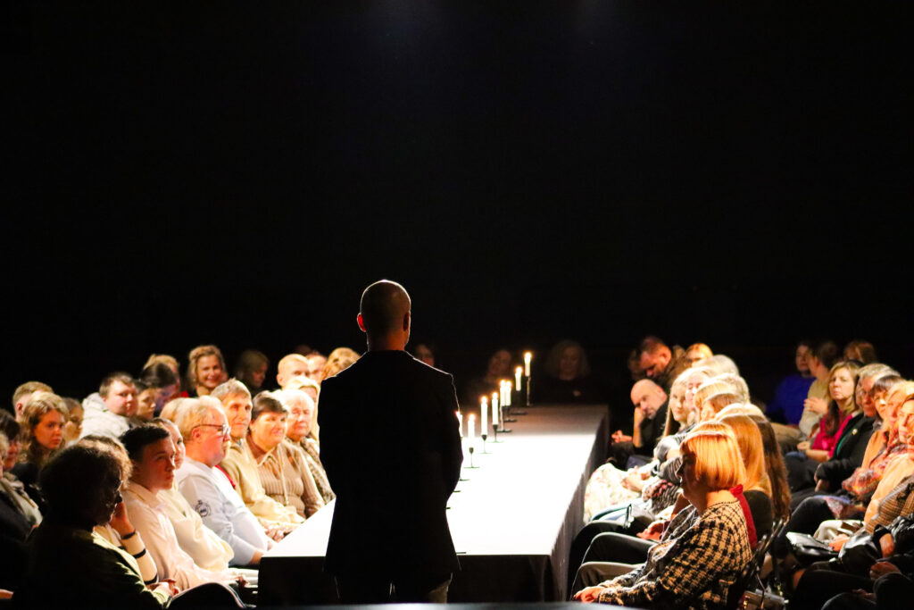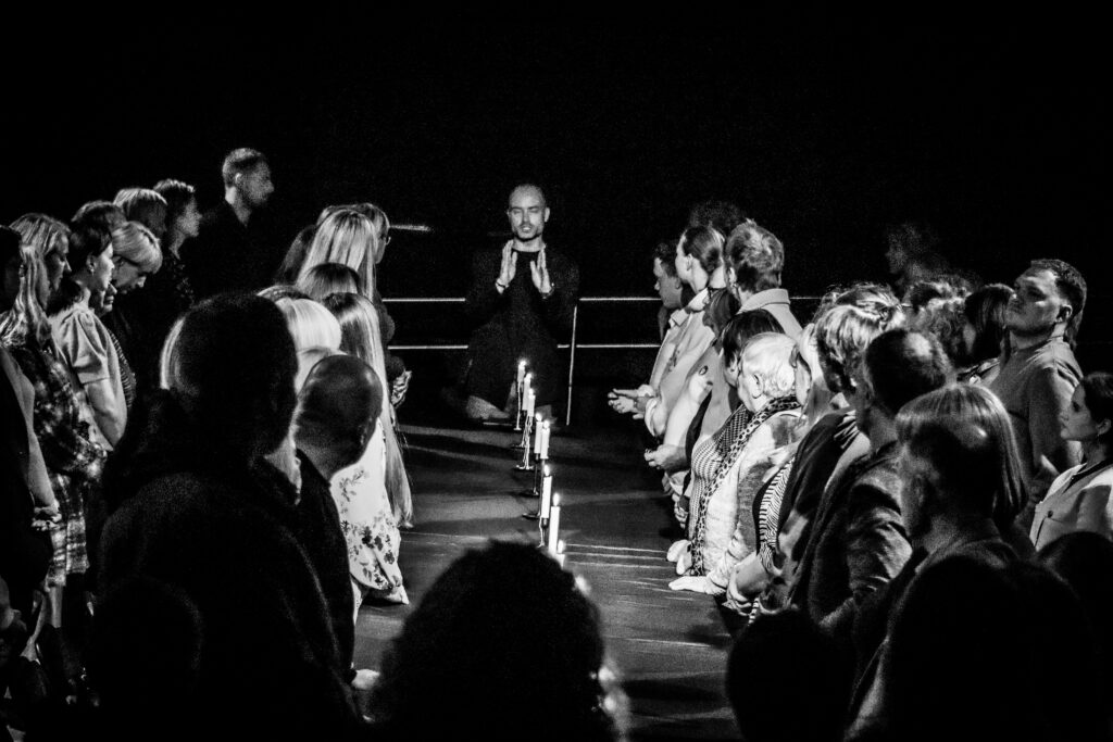 Vakare žiūrovai buvo pakviesti į monospektaklį „Myriop“, sukėlusį stiprų emocinį atgarsį. Pasitelkdamas „Storytelling“ metodiką, Aleksandras Špilevojus gvildeno fizinės ir dvasinės mirties temas, atvirai dalydamasis asmenine vizija, kaip galėtų atrodyti jo paties laidotuvės.